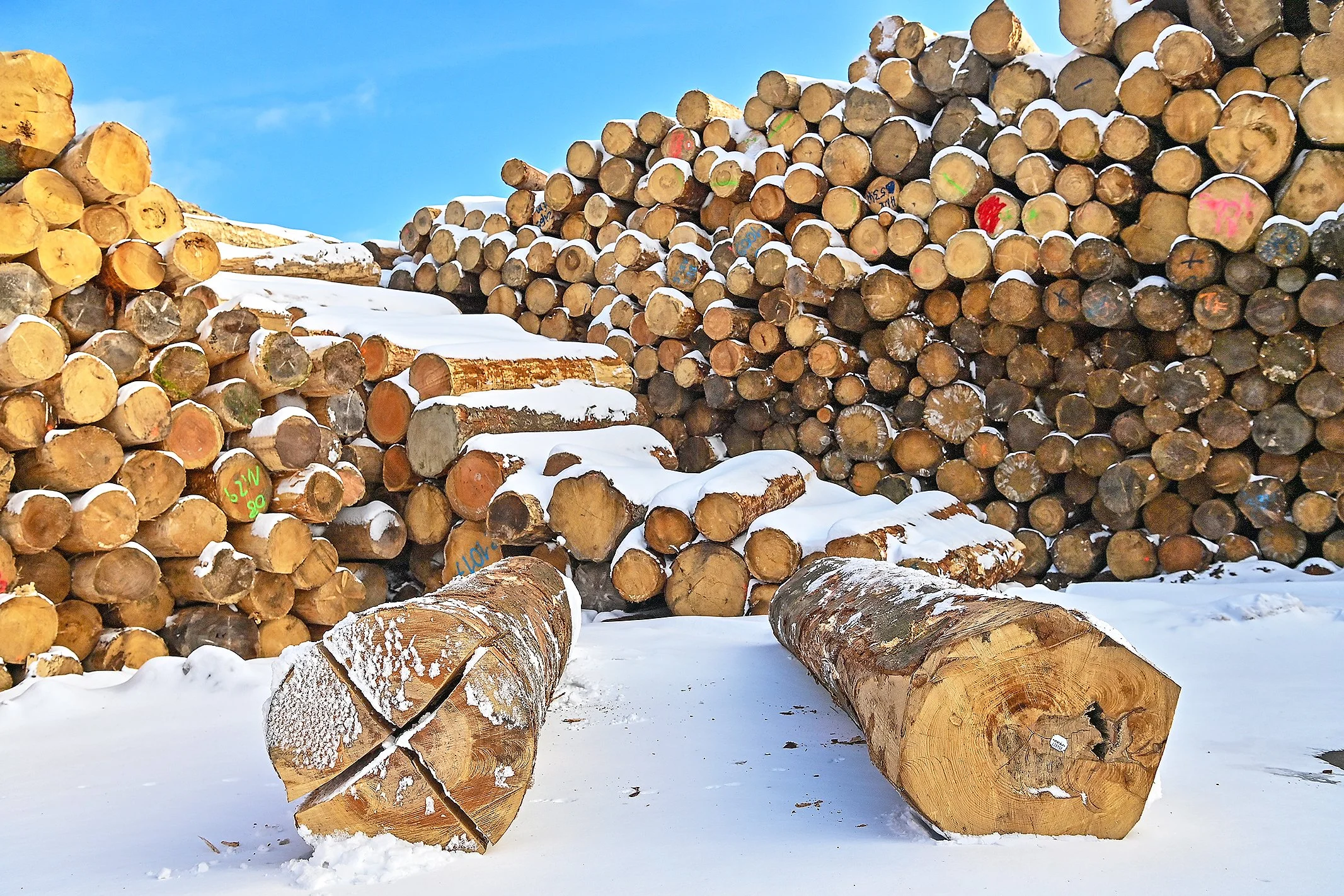 Technisch sei Buchenholz dabei allerdings eine Herausforderung – insbesondere, wenn das Rundholz Spannungen aufweist. „Wir haben da viel probiert und viel gelernt im vergangenen Jahr“, berichtet Jan-Philipp Alhäuser, während er auf dem Rundholzplatz des Westerwälder Unternehmens, in dem er tätig ist, zwei Buchenabschnitte zeigt: Der rechte hat eine glatte Schnittfläche. Der linke jedoch sieht wie geviertelt aus, lange Risse durchziehen ihn. Diese entstehen, so schildert der Betriebsleiter, durch Spannungen im Holz, die beispielsweise beim Fällen freiwerden können.