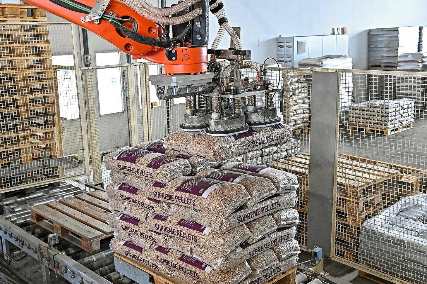 „Mitarbeiter“ ohne Rückenschmerzen: Der Roboter übernimmt das Stapeln der „Supreme Pellets“.