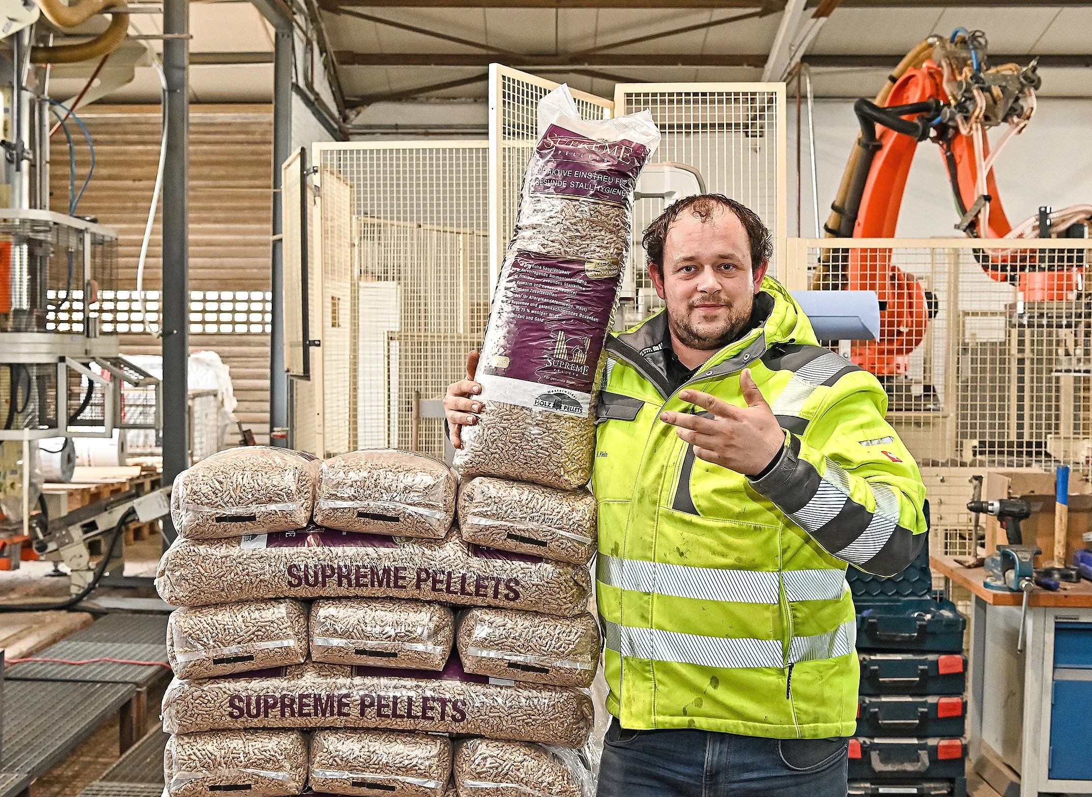 Nils Buchner dürfte froh sein, diesen „Arbeitskollegen“ zur Seite zu haben! Denn der übernimmt es für ihn, die länglichen Säcke von einem Förderband zu nehmen, sie zu heben und auf Paletten zu stapeln, während Buchner die Pellet-Absackanlage der „Westerwälder Holzwerke“ (WWHW) bedient. Elf Lagen schichtet der „Kollege“ übereinander, bestehend aus je fünf Säcken – jeder davon 14 Kilogramm schwer. Dieser „Kollege“ jedoch ist kein Mensch, sondern ein Roboter. Und er greift die Säcke auch nicht, sondern packt sie mittels Unterdruck mit vier Saugnäpfen. „Supreme Pellets“ steht auf diesen Säcken. Ist da also etwas anderes drin als die bewährten Westerwälder Holzpellets?